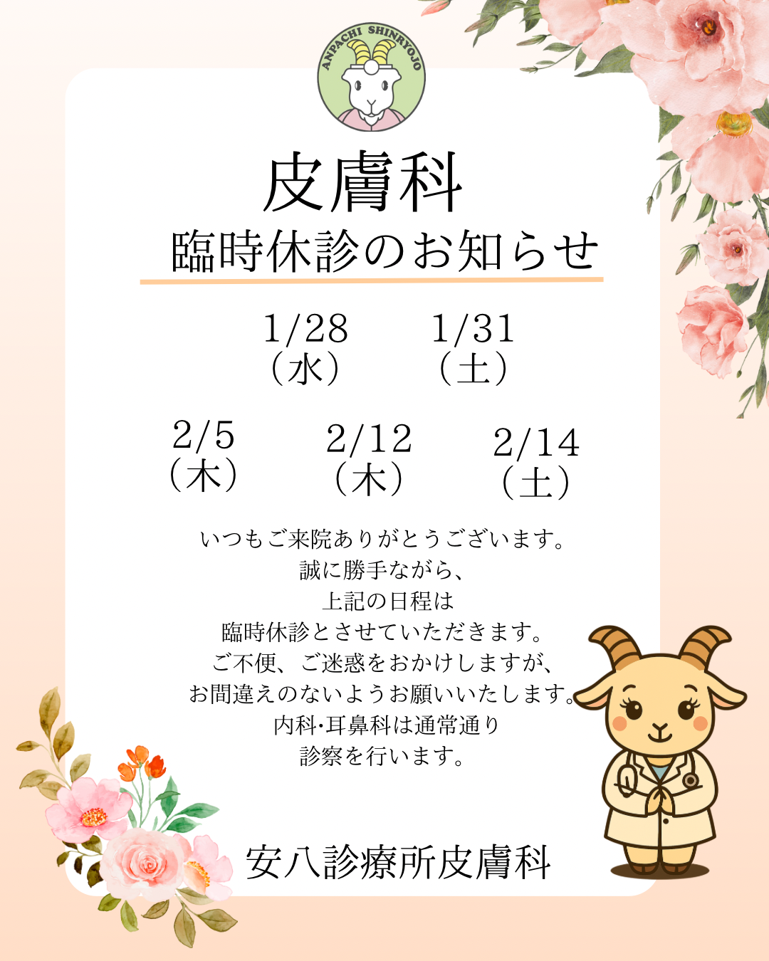 誠に勝手ながら、下記の日程は臨時休診とさせていただきます。ご不便、ご迷惑をおかけしますが、お間違えのないようお願いいたします。