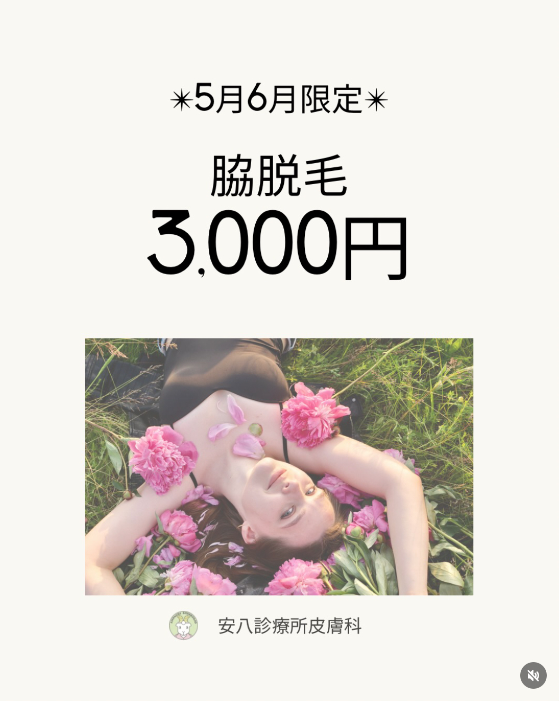 脇脱毛通常5,500のところ、期間中は3,000円で施術できます。ご希望の方は診療時間内に皮膚科までお越しください。